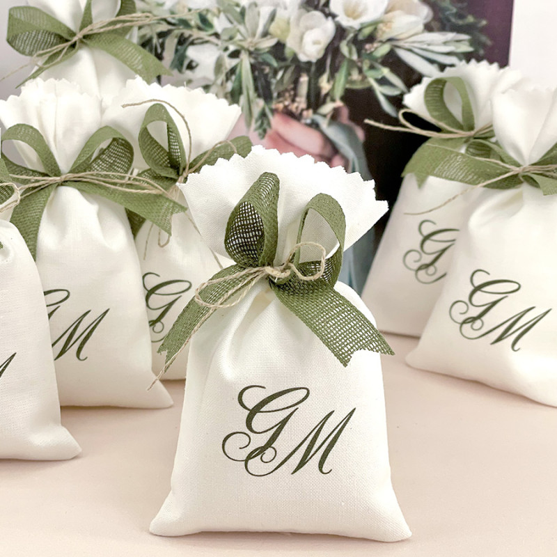 Le nostre bomboniere sono realizzate con tessuti naturali di qualità come il cotone e il lino. Utilizziamo tessuti neutri (bianco, avorio e panna) sui quali stampiamo la grafica personalizzata.