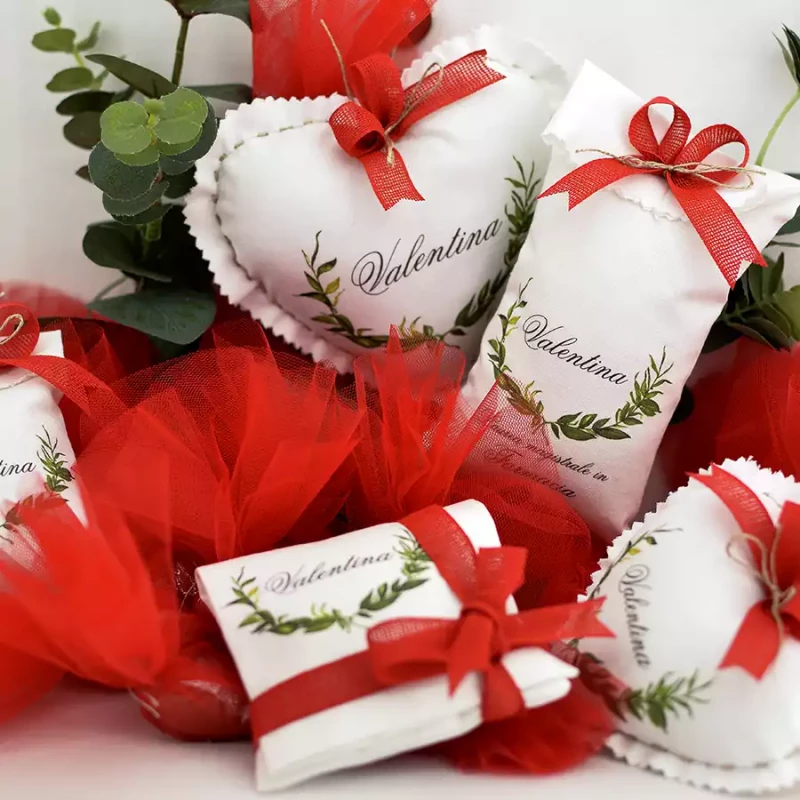 Per gran parte dei nostri articoli, impieghiamo nastri in cotone larghi 12 mm, disponibili in varie tonalità. Per alcuni modelli specifici come i cuscinetti profumati, optiamo per nastri color panna in doppio raso larghi 15 mm, i quali offrono la possibilità di personalizzazione con il tuo testo.