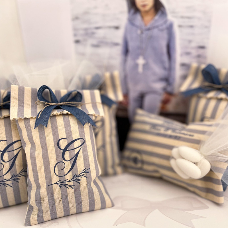 Le nostre bomboniere sono realizzate con tessuti naturali di qualità come il cotone e il lino. Utilizziamo tessuti neutri (bianco, avorio e panna) sui quali stampiamo la grafica personalizzata.