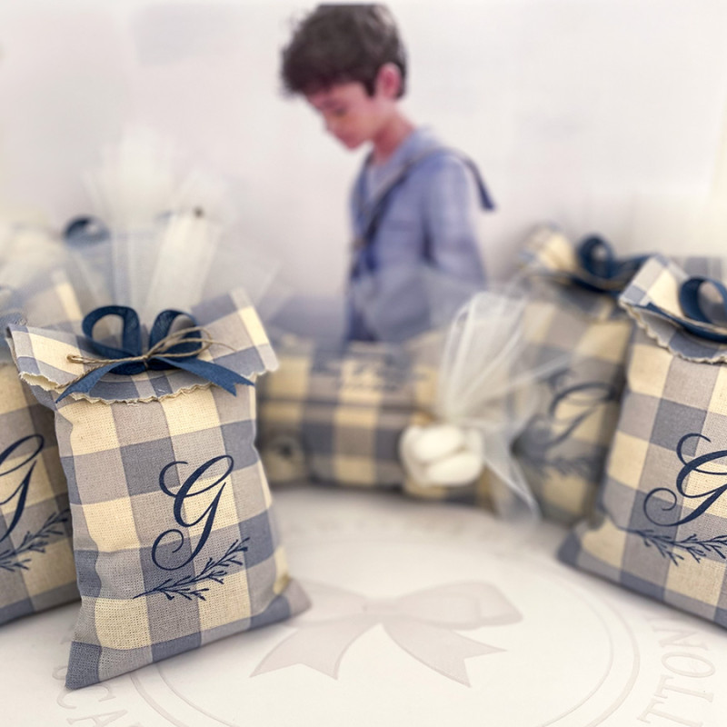 Le nostre bomboniere sono realizzate con tessuti naturali di qualità come il cotone e il lino. Utilizziamo tessuti neutri (bianco, avorio e panna) sui quali stampiamo la grafica personalizzata.
